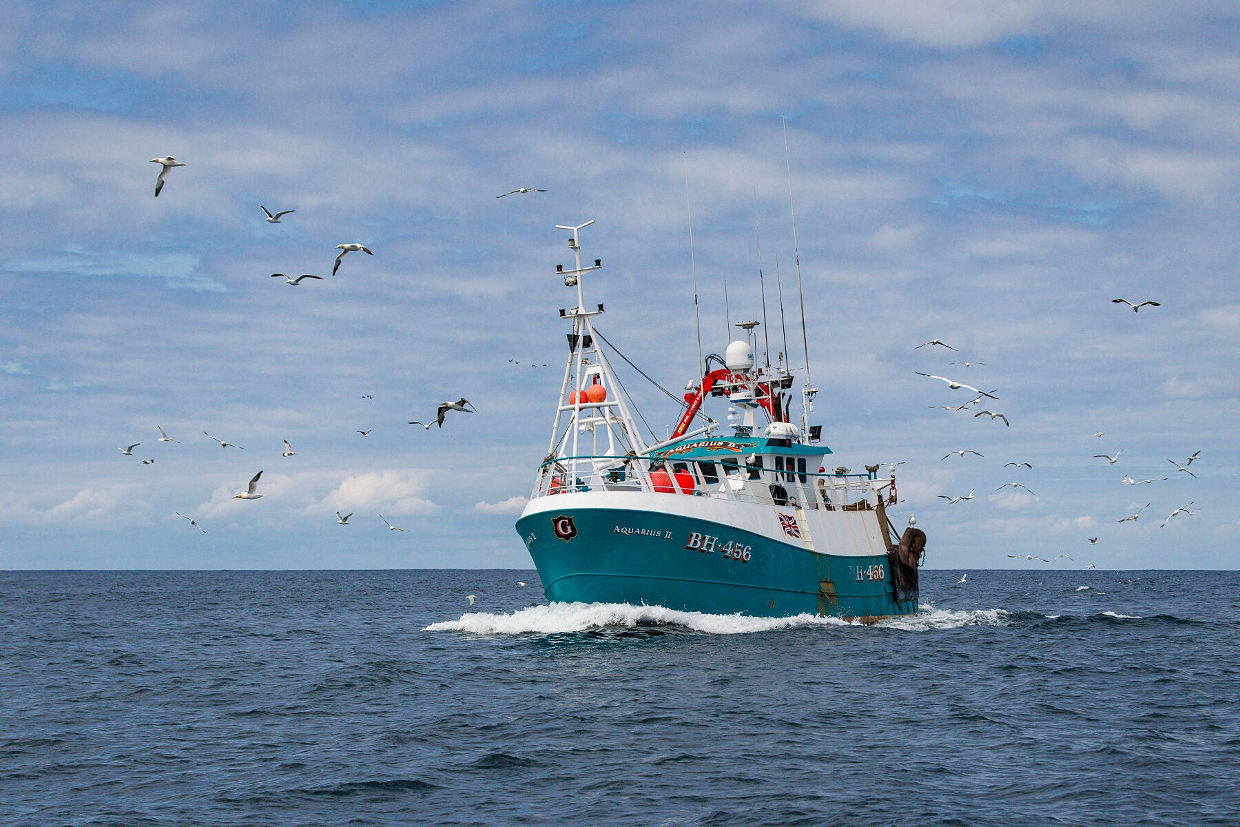A Scottish fishing boat on its way back to port on the Firth of Forth, Scotland. Fishing is one of the most difficult and dangerous occupations. This landscape (horizontal) format colour picture was created at sea in the Firth of Forth. It captures the atmosphere of the life at sea with sea birds always in attendance.