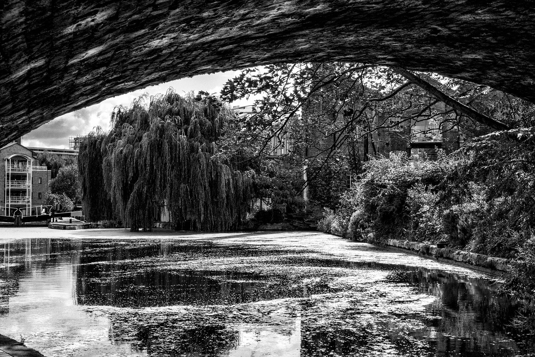 Taking goods closer to the population centre of London instead of the long road trip from Paddington brought trade to the area. The New Road (later Pentonville Road) was built from Paddington to Islington in 1756. This was extended from Islington into London as the City Road in 1761. So when the City Road Basin was opened in 1820 the infrastructure for gett goods to London was already there. This black and white landscape (horizontal) format print shows the view looking east towards the City Road Lock from under the Danbury Street Bridge.