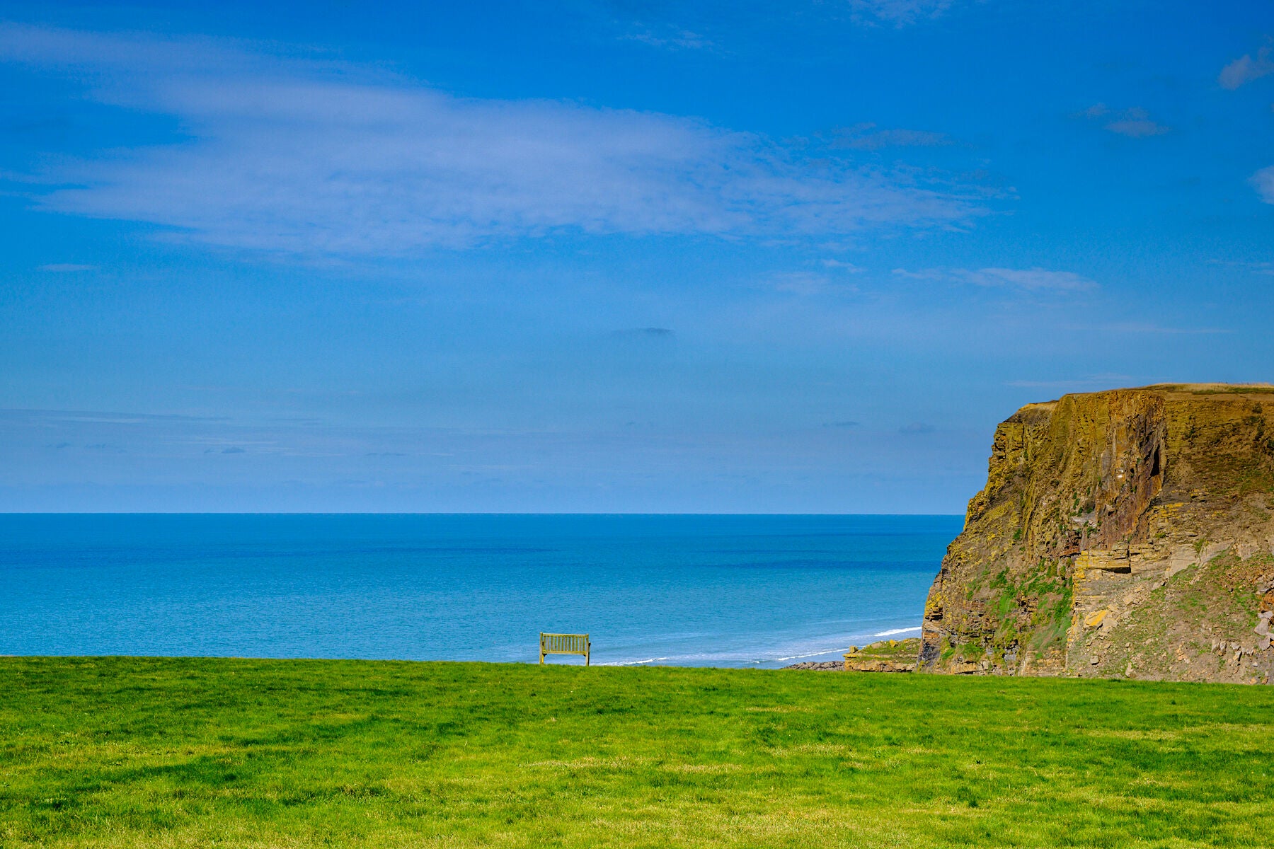 This bench sits on the cliff top looking northwest towards Lundy Island. It provides a vantage point with beautiful views of the sea and the rugged Cornish coast of Bude Bay. The weathering and algae growing on the wood of the bench give it a green hue to blend with the grass around it. The landscape (horizontal) format print has bee created from a photograph produced whilst walking between the village of Widemouth Bay and the town of Bude.