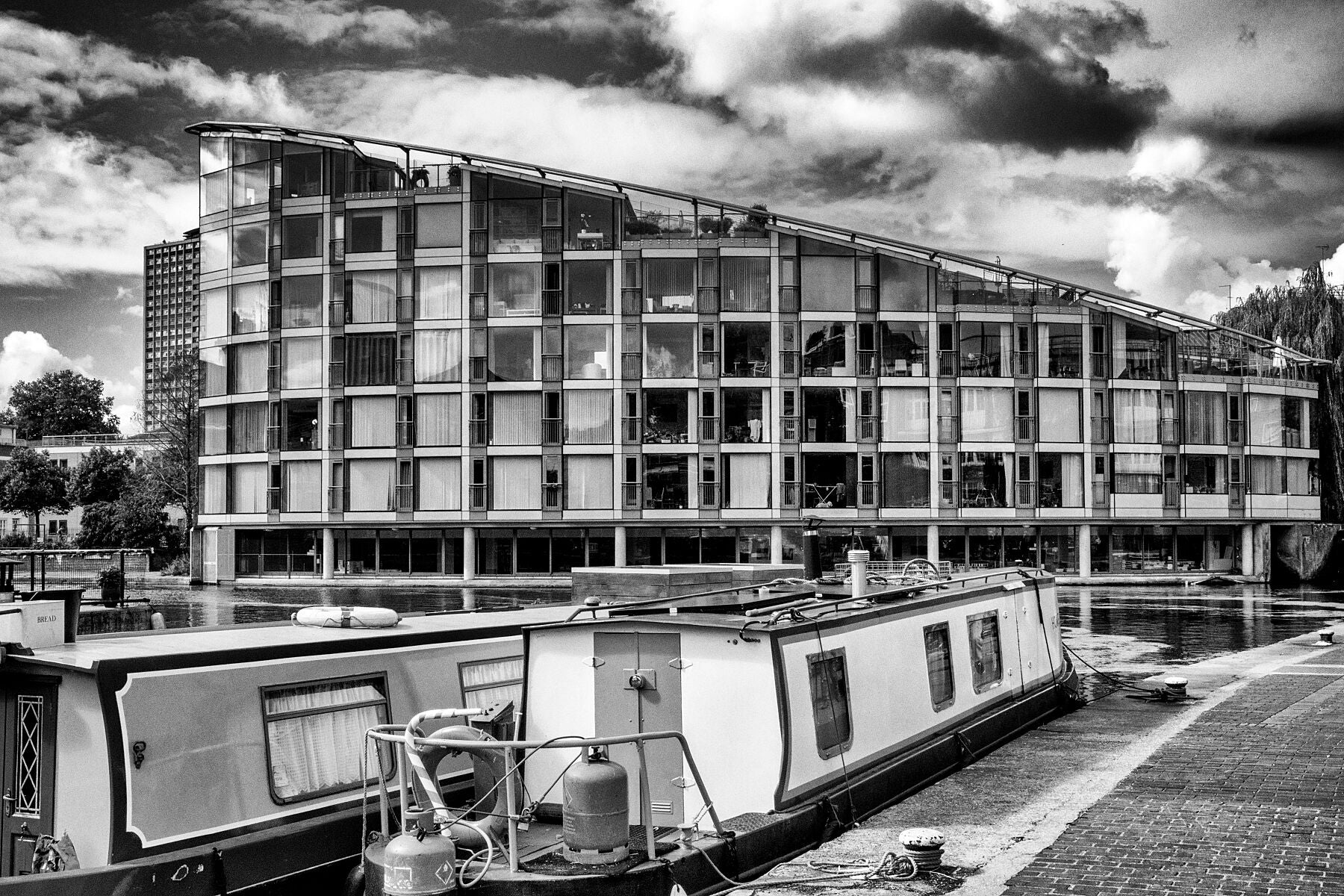 Crystal Wharf contains 56 apartments and design studios. They are arranged in three distinctive wings around a landscaped courtyard and have wonderful views along the Regent’s Canal. Built on a corner of the once bustling City Road Basin it has great access to the City. The Basin used to be longer, with a bridge carrying the City Road over it. That end has now been filled in and where once wharves, workshops and stables stood there are now public gardens, offices and apartments. The City Road Basin gave prosperity to the region, being a good place to unload boat cargo from the Midlands for transporting onwards to London. It was much better situated for this than either Brentford or Paddington. This black and white landscape (horizontal) format print has been created from a photograph made from the towpath on the opposite side of the canal.