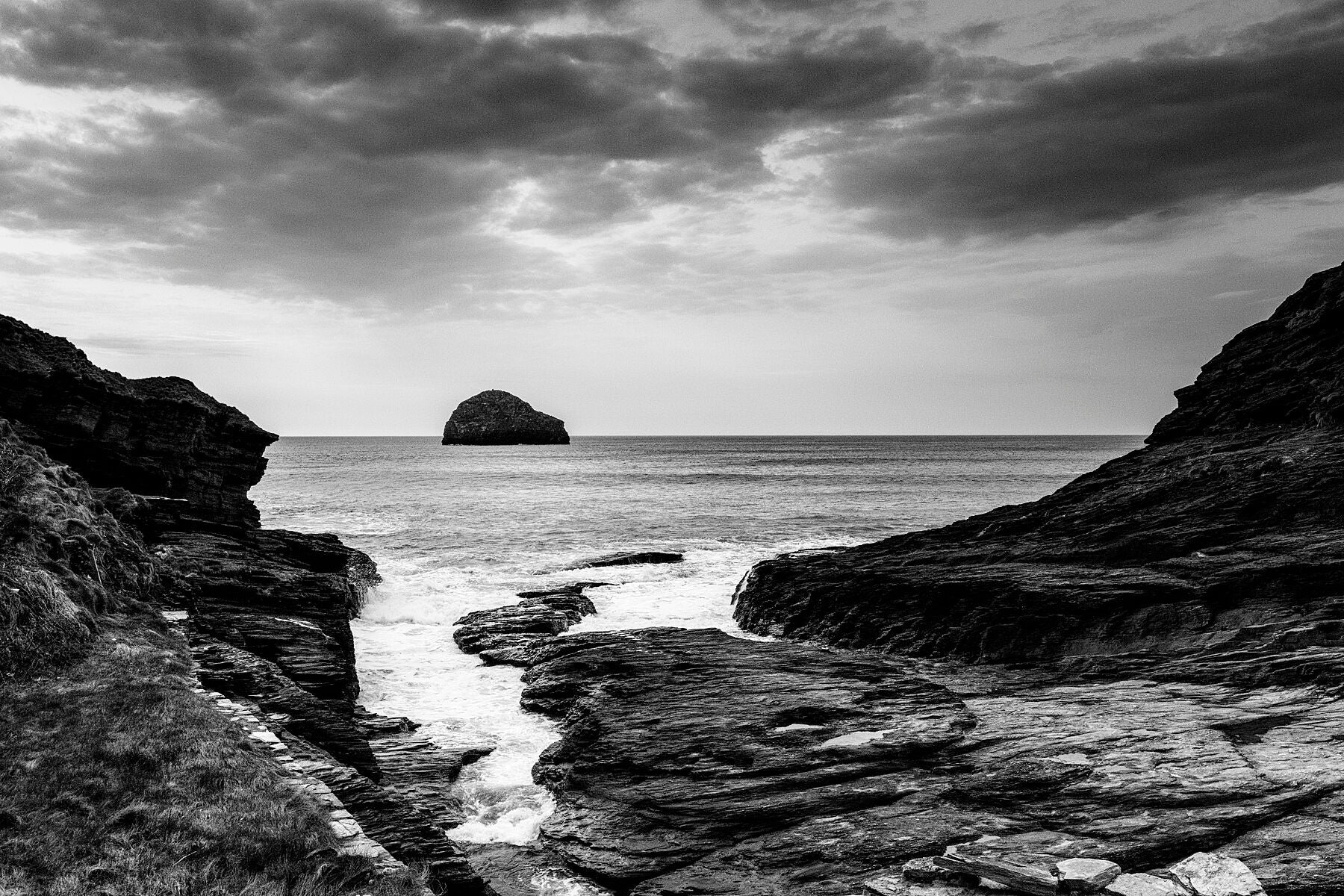 Gull Rock is a well known island landmark of the Atlantic north coast of Cornwall, England. Just over two miles from Tintagel, of King Arthur’s legends it lies opposite Trebarwith Strand and Port William, where I made the photograph from which this landscape (horizontal) format print was produced.