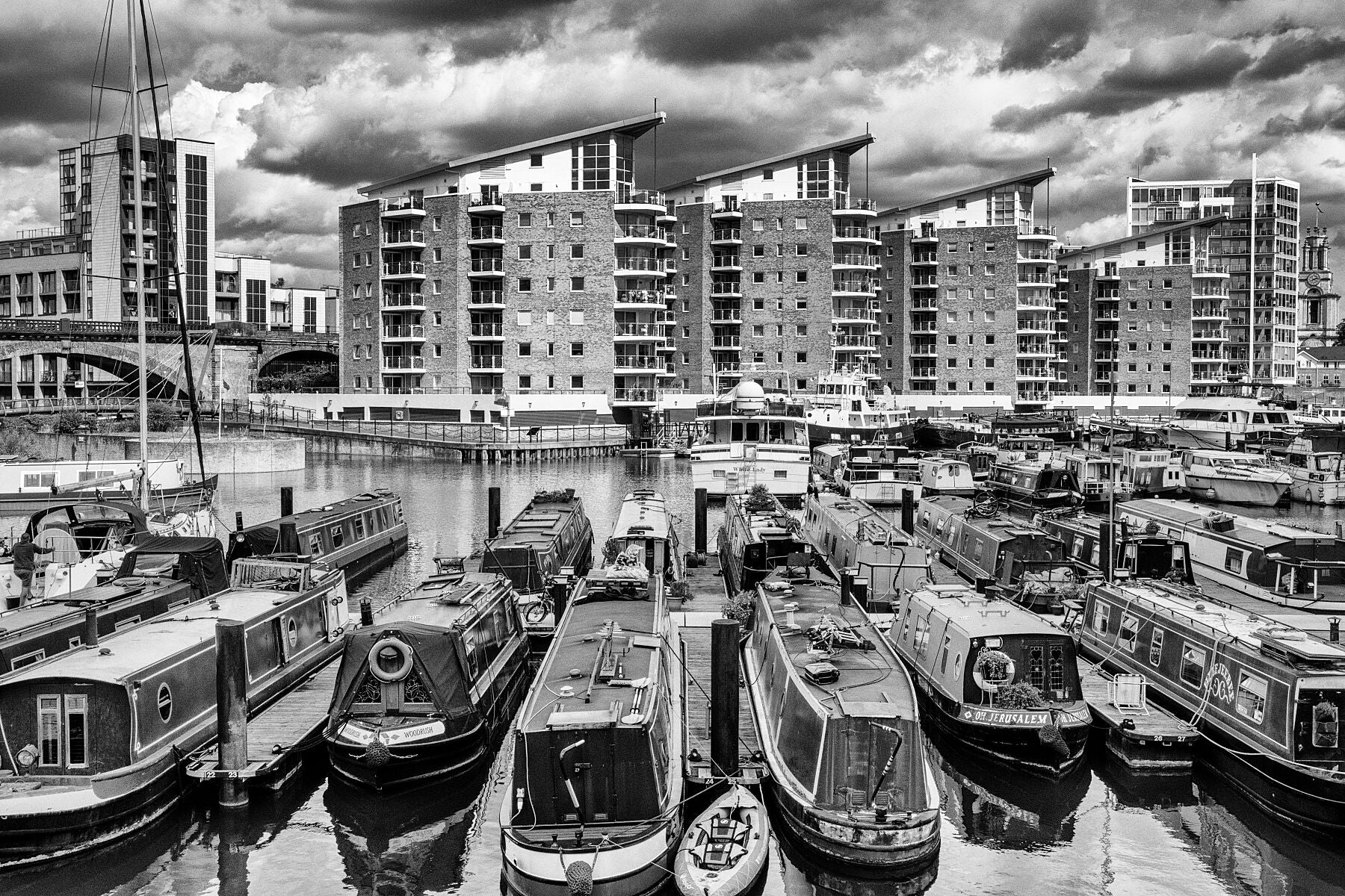 The four buildings of Marina Heights contain luxury apartments. Most of them with views over the waters of Limehouse Basin and the River Thames. Built in 1998 these prestigious homes have one, two or three bedrooms. They are ideally situated for commuting to the City or Canary Wharf and so command the high prices you would expect. Out of sight behind Marina Heights is the unusual, octagonal pumping station. It housed a steam engine to provide hydraulic pressure used to drive capstans, lock gates, swing bridges and the innovative machinery for handling coal. Surely the subject for a future print.