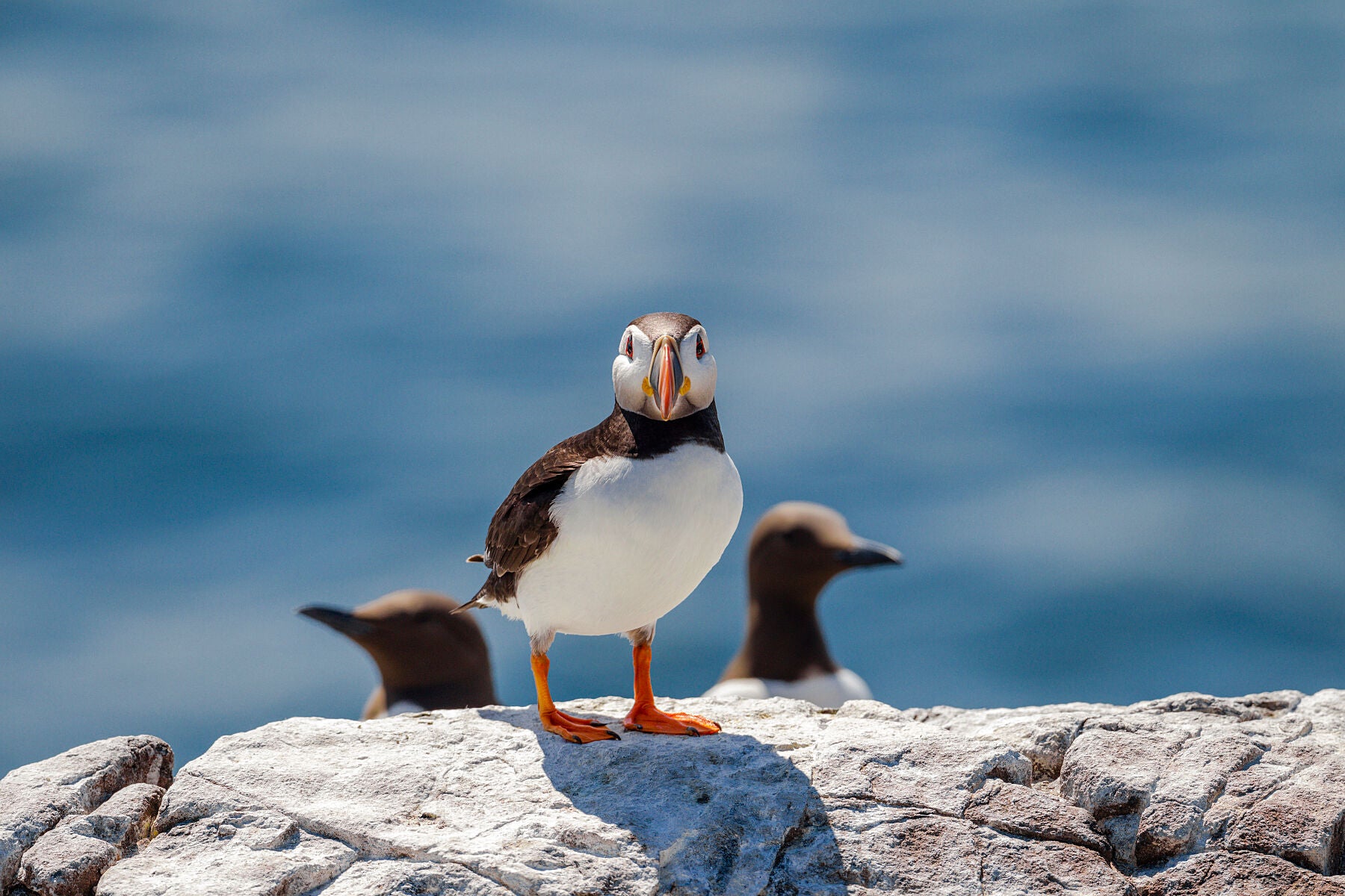Photographed by Graham several years ago, the Puffin remains a favourite bird for so many people. The Puffins found in the UK are the Atlantic Puffin (Fratercula arctica), also known as the Common Puffin. It is one of four species of Puffin. These seabirds are all members of the Alcidae or Auk family. Shown in the bright colours of breeding plumage this colour landscape (horizontal) format image has the Puffin flanked by two, out of focus Guillemots (Uria Aalge).