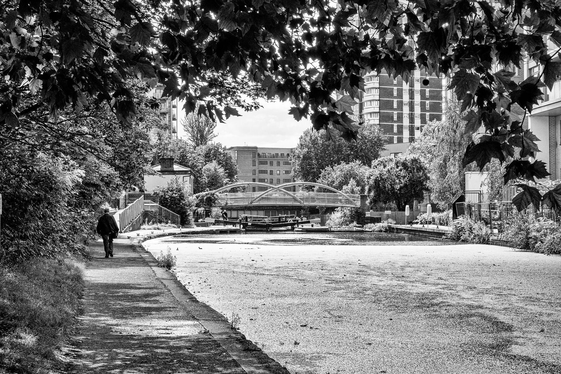 Lock 11 on the Regent’s Canal, Salmon Lane Lock is in the Limehouse area of the London Borough of Tower Hamlets. This black and white landscape (horizontal) format print was created from a photograph made on the towpath across the canal from Frank Whipple Place, looking south. The modern-looking Parnham Street footbridge is just beyond the lock and was erected in 2005. The lock only has gates on one side, the other side is no longer navigable.