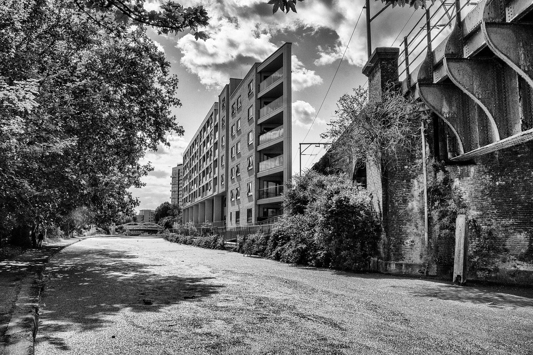 Tracey Bellamy Court is in the northernmost angle of Frank Whipple Estate, between Regent’s Canal and the railway lines. This block of sixty social housing homes in Tower Hamlets, London was opened in June 2015. Frank Whipple came to London as a youngster in 1916, when his family moved from Ireland. He started supporting Millwall Football Club in in 1918 and stayed with them until his death in 2011, aged 103. Frank was a shop steward for garment workers and held strong political views. He was involved in the General Strike fought against fascists in Cable Street in the 1930’s and served in the police in WW2. The estate is close to where he lived. Three of the blocks are named after local footballers of the WWI era: Bill Voisey, Walter Tull and George Hilsdon. The fourth block is named after Tracey Bellamy who had worked for Tower Hamlets Community Housing and had passed away in 2011. The footbridge near Salmon Lane Lock can be seen in the distance of this black and white landscape (horizontal) format print which was created from a photograph made from the towpath, across the canal to the northeast.