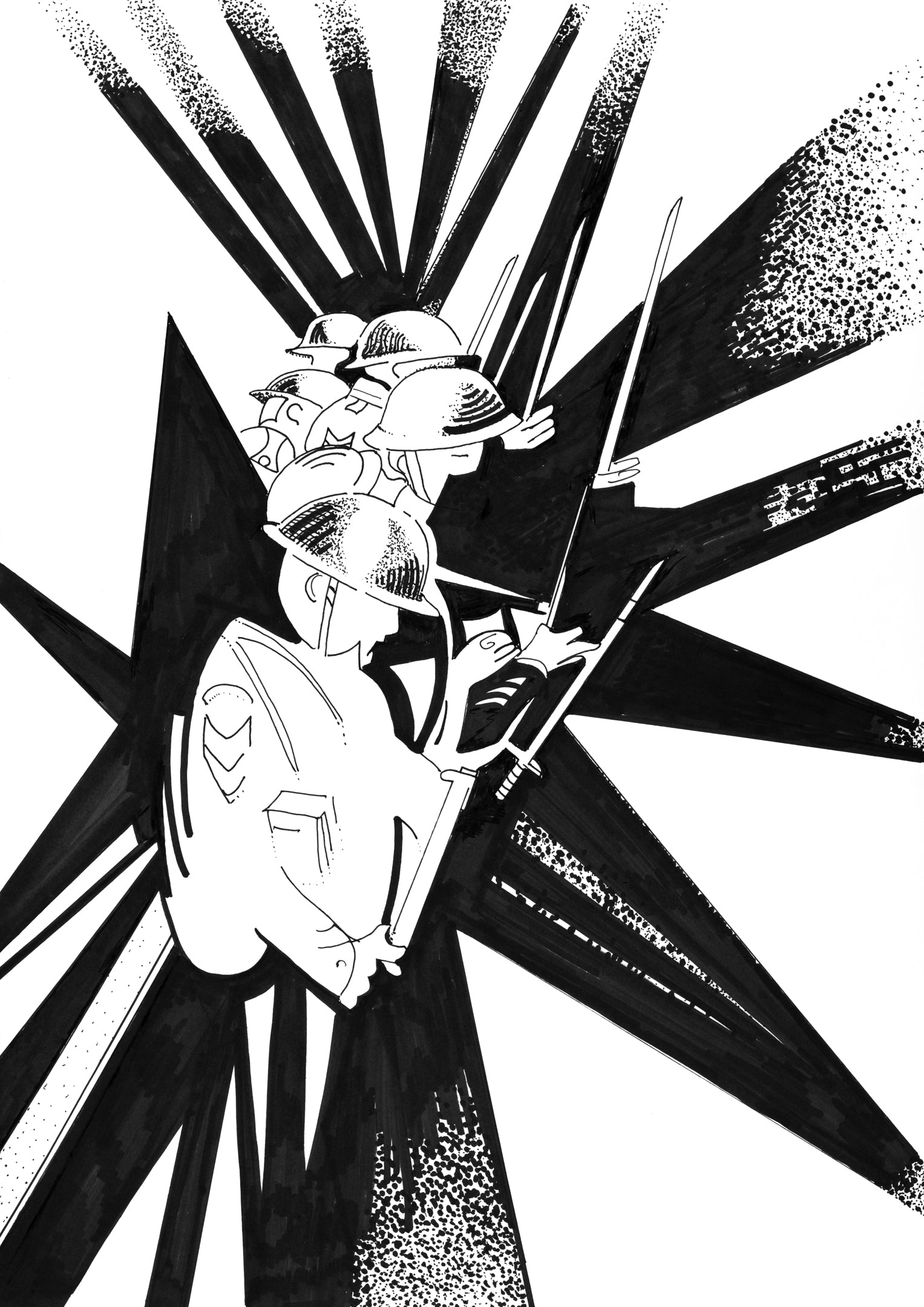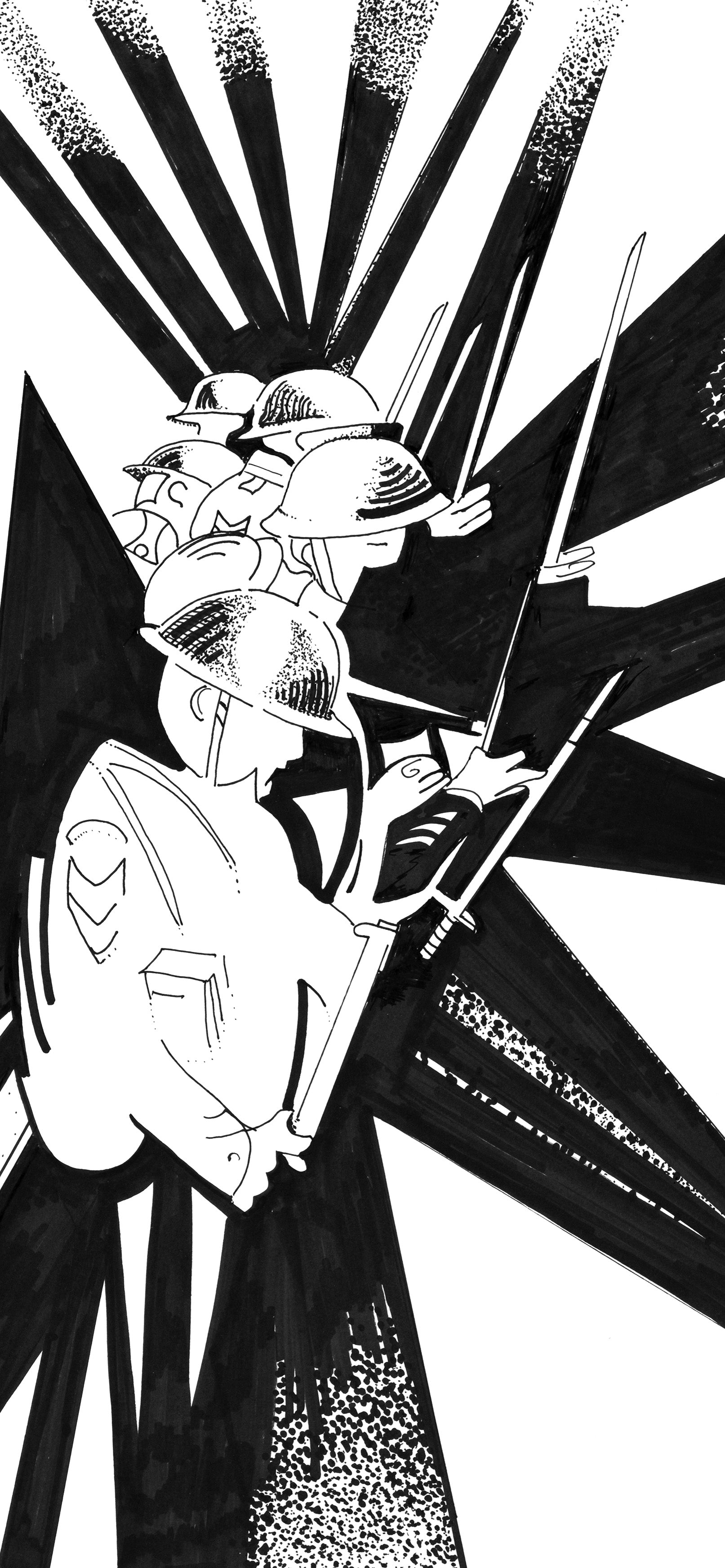 “Fix Bayonets” : The light plays over the trench as the bayonets are fixed. Shapes and outlines bathed in light and shadow.