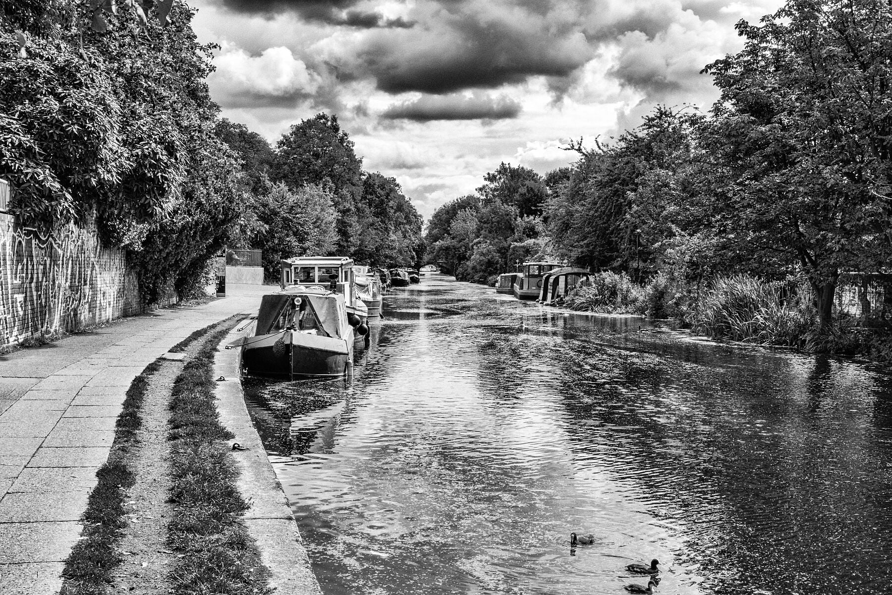 Victoria Park is London’s oldest, purpose-built park having been opened to the public in 1845. This landscape (horizontal) format print shows where the Regent’s Canal runs along the western end of the park. The park lies in the Tower Hamlets area of London and has over nine million visitors each year. It has a reputation as the ‘people’s park’, has long been popular with public speakers and marches and processions often start there.